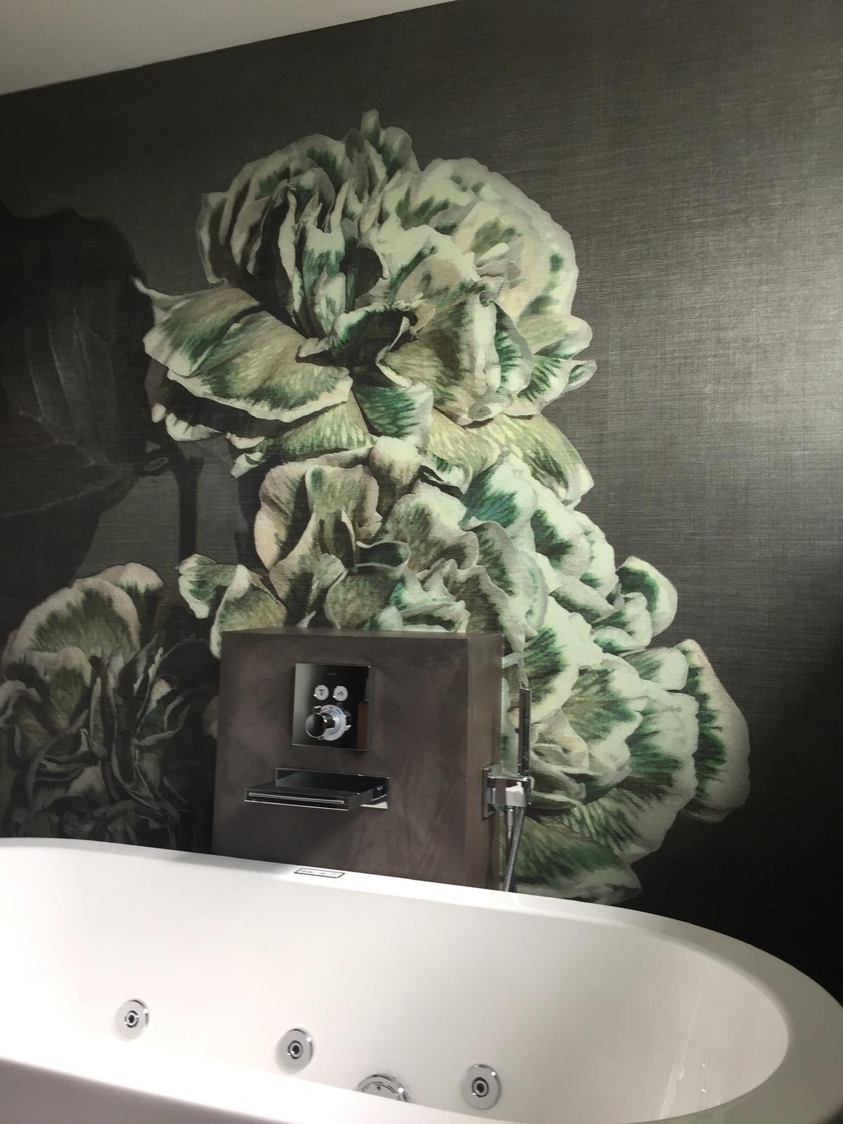 Fiber glass wandafwerking met unieke print achter bad. Deze kan zelfs toegepast worden in een douche op zowel wanden als vloer!