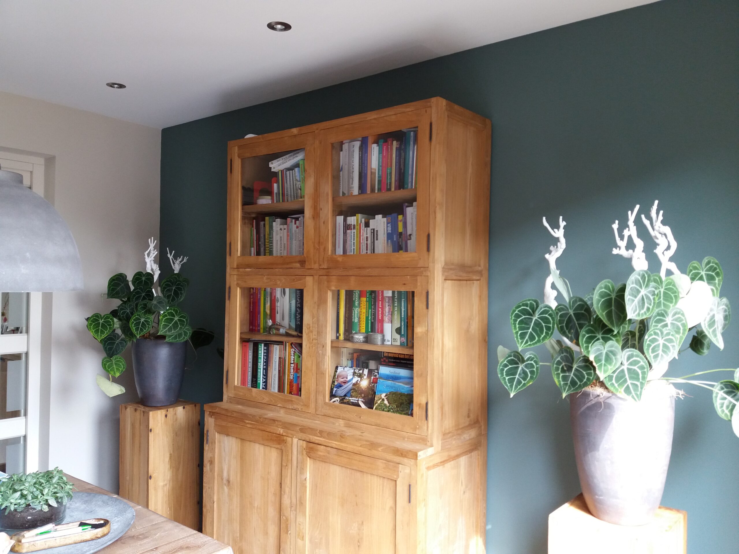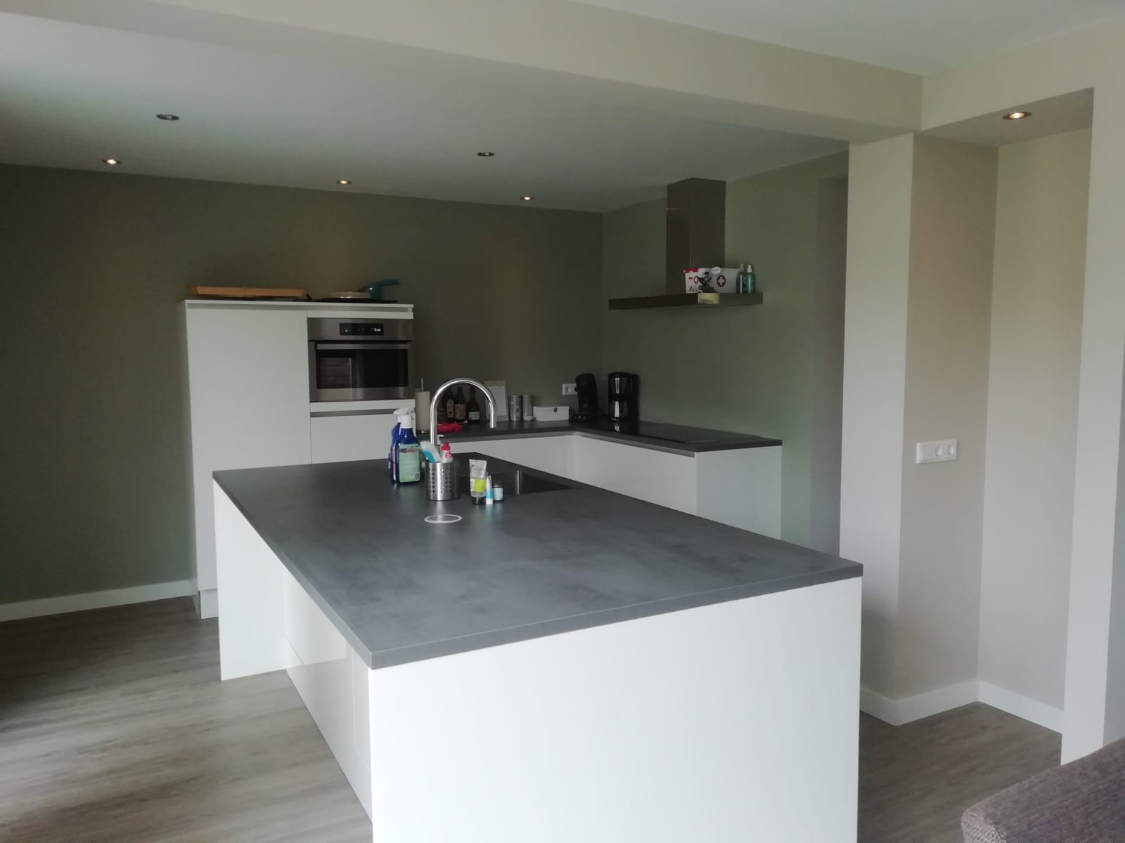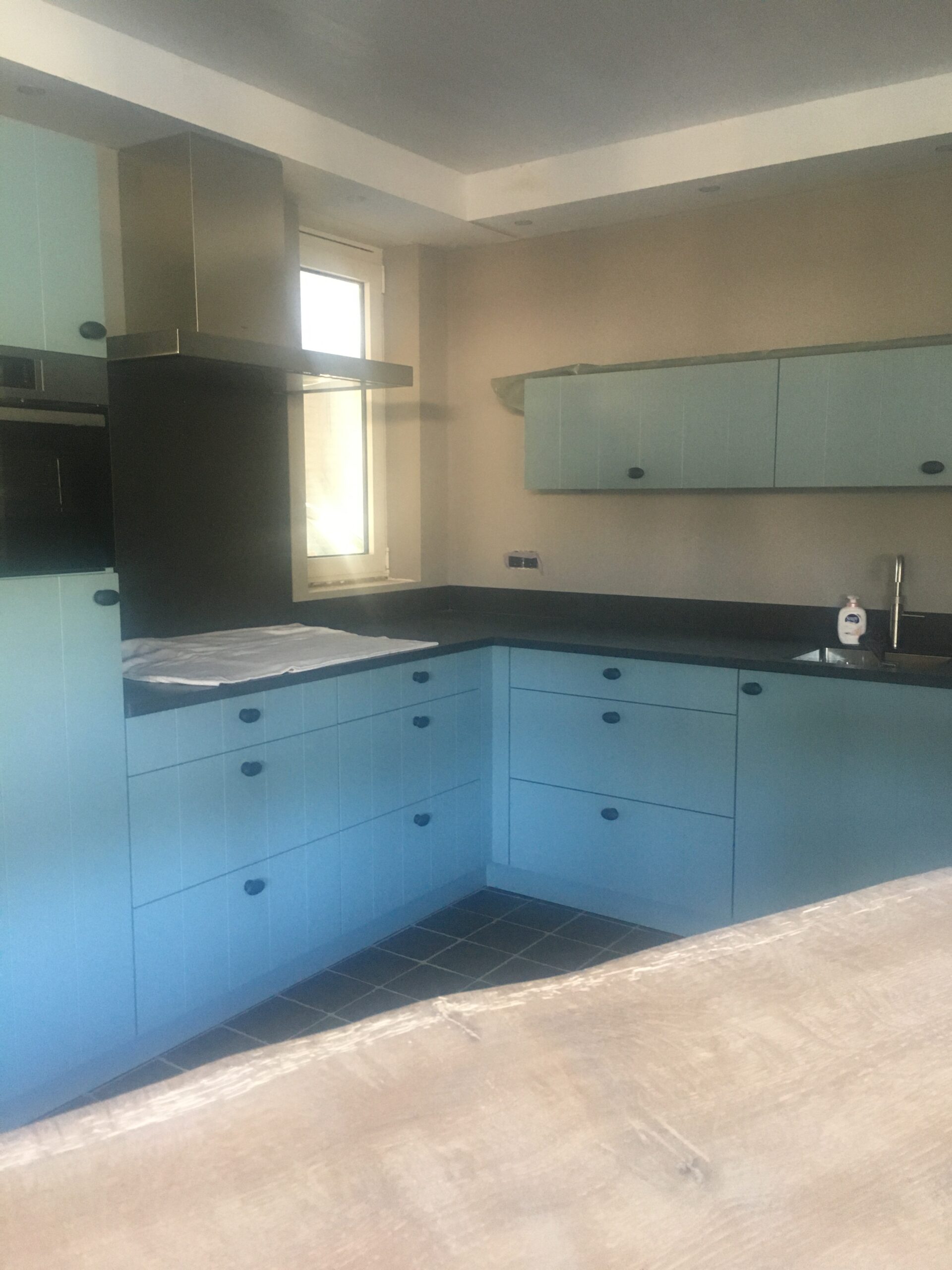 Ontwerp van keuken inclusief kleuradvies wanden, plafonds, deuren en kozijnen. Extra reinigbare coating toegepast op de spatwand waardoor wandtegels niet nodig zijn.