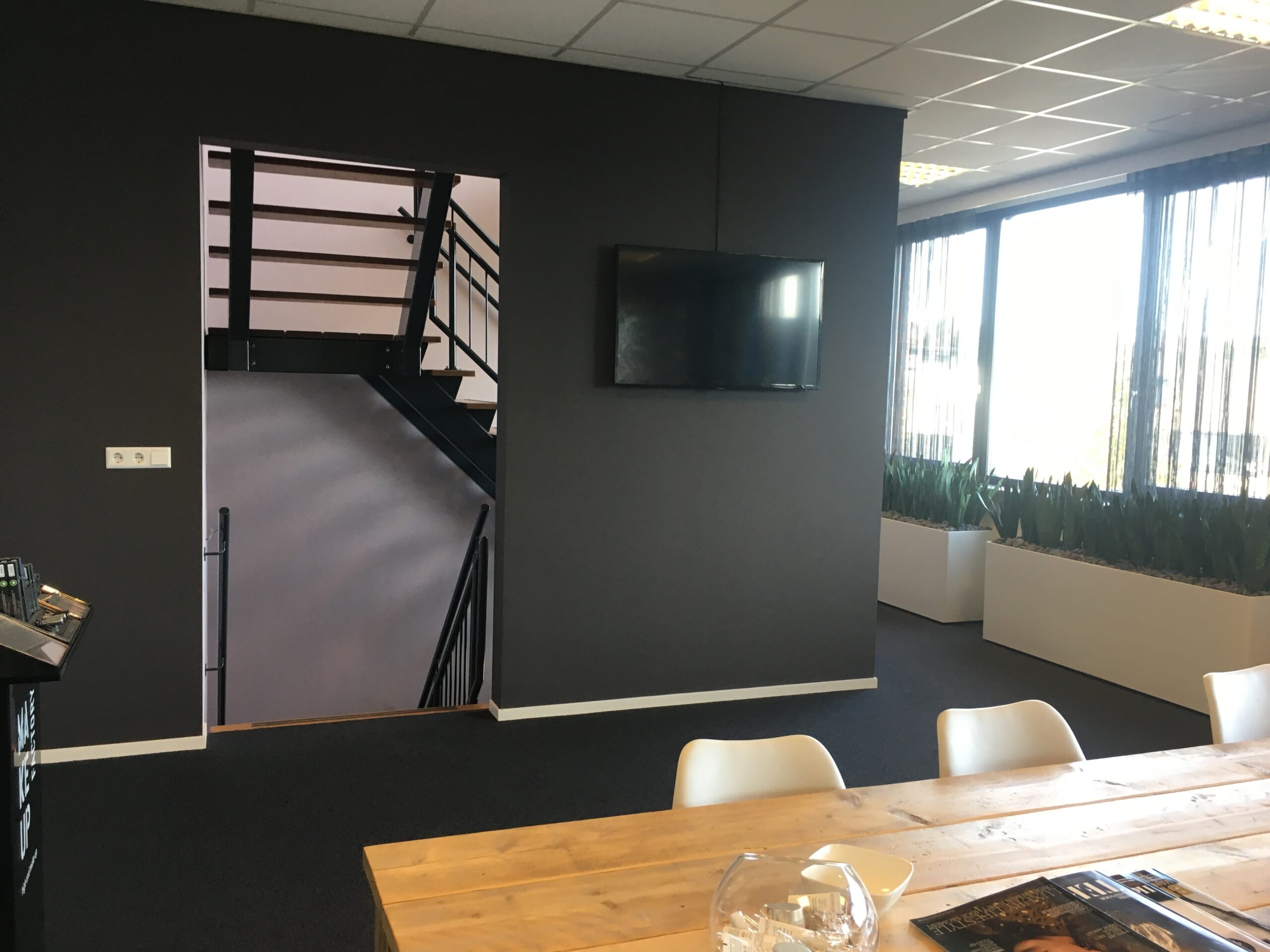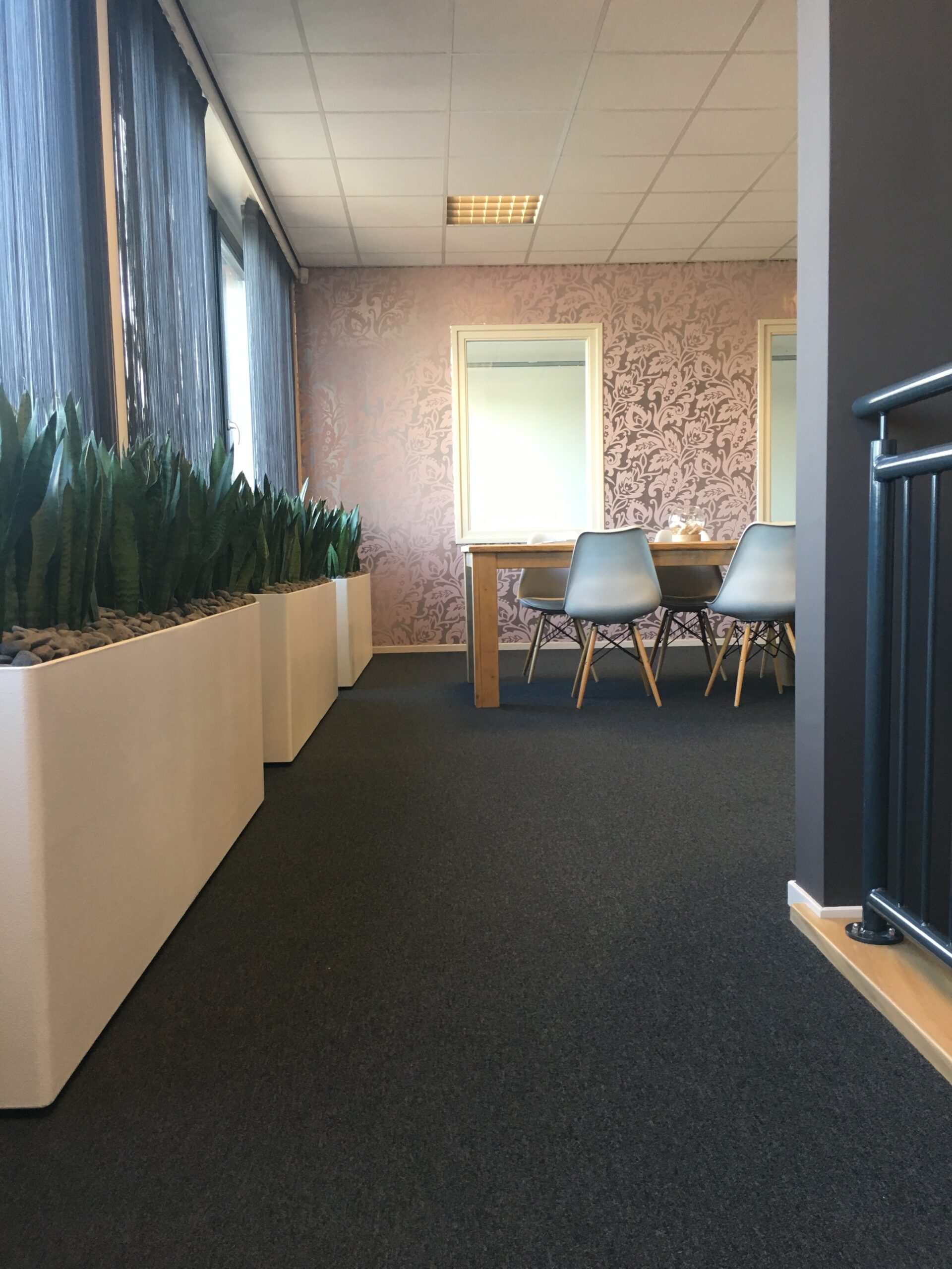 Het gehele pand was in dezelfde wittint geschilderd. Door middel van kleur op de wanden, behang en aankleding van planten en raambekledingen het kantoor een mooie nieuwe uitstraling gegeven.