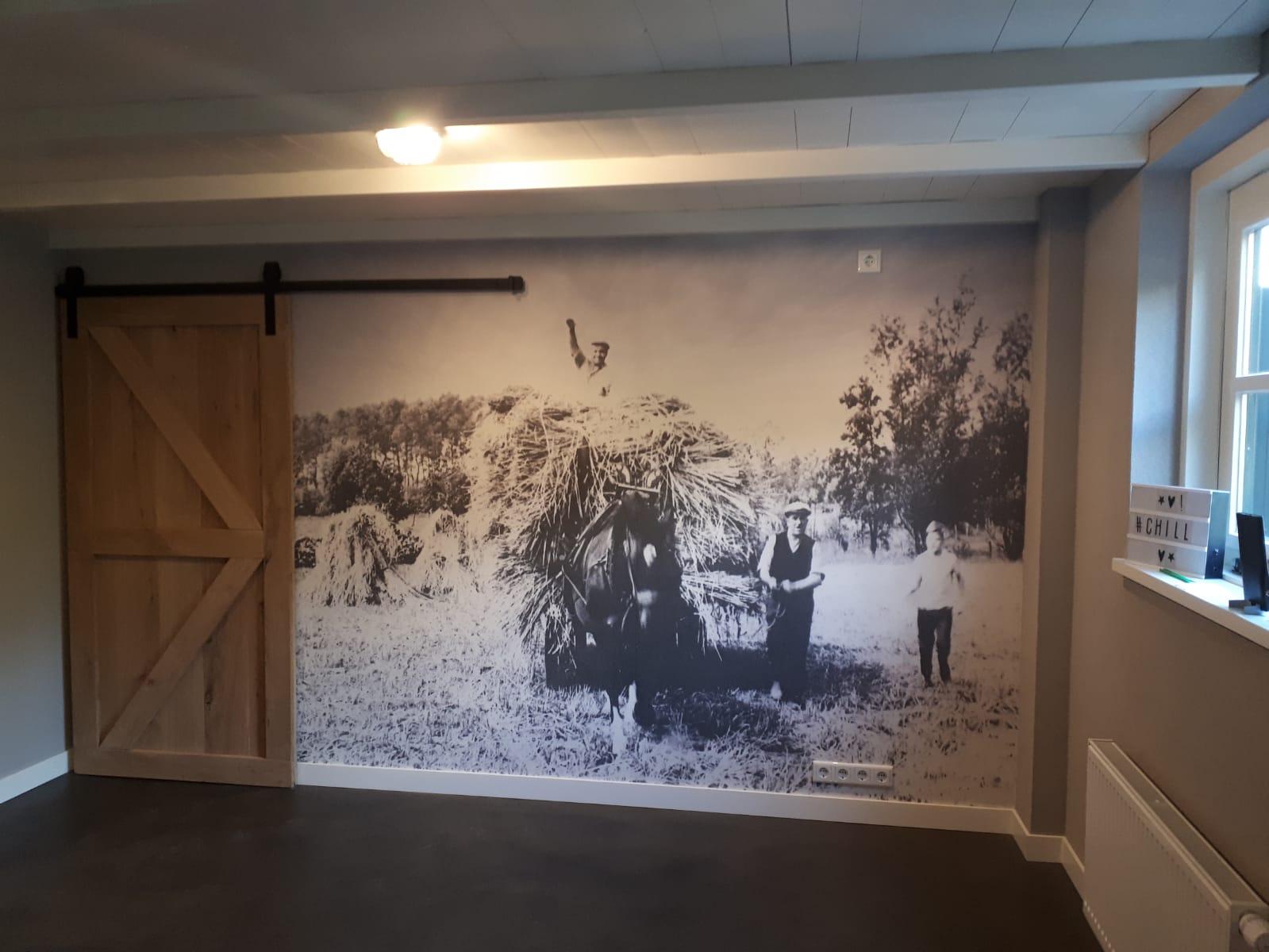 Of een eigen gekozen foto als behang uitgevoerd kon worden? Natuurlijk! De deur en scharnieren! zijn tevens voorzien van behang en daardoor nauwelijks zichtbaar.