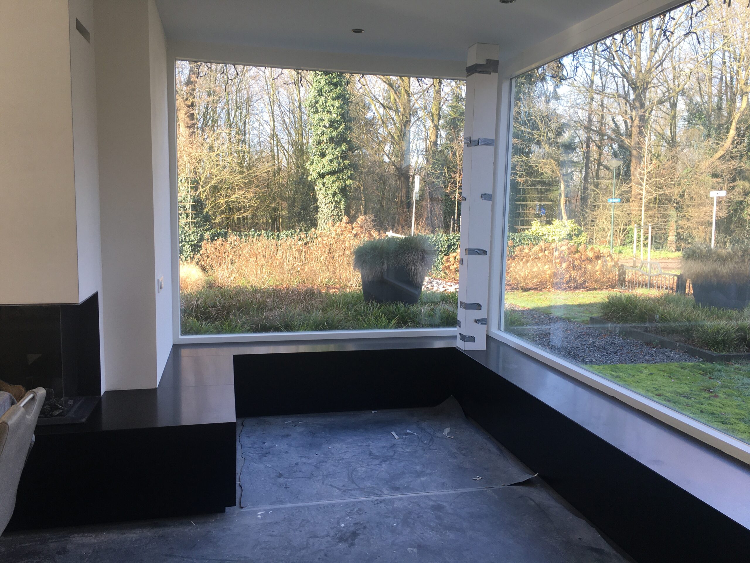De smalle originele vensterbanken zijn vervangen door een natuurstenen ombouw welke prachtig overloopt in het plateau rondom de haard. Door deze afwerking groter neer te zetten wordt de eerder verloren hoek meer betrokken bij het zitgedeelte.